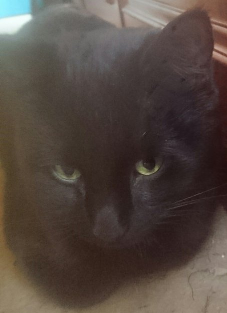 Robin kom seg ut gjennom katteluka. Han var i fosterhjem her. Han var hos oss en uke og ble tryggere. Han prater, kan klappes og løftes, men er litt forsiktig.