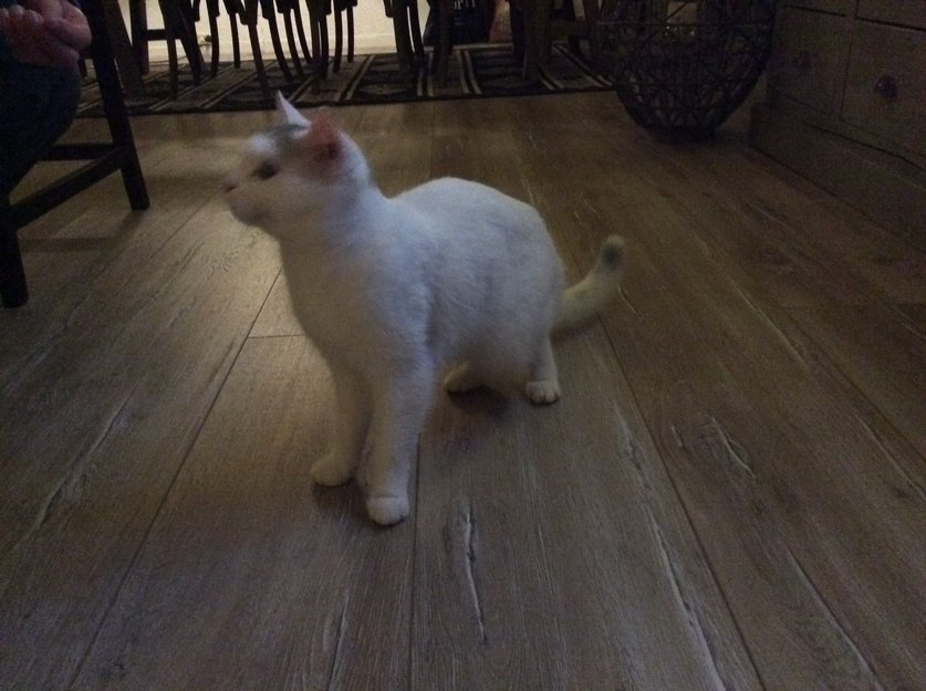 Ung hunnkatt har gått og skreket i vår lille gate siden natt til i dag. Hun er nå tatt inn, og hun er helt tam og veldig glad for mat, vann og kos.