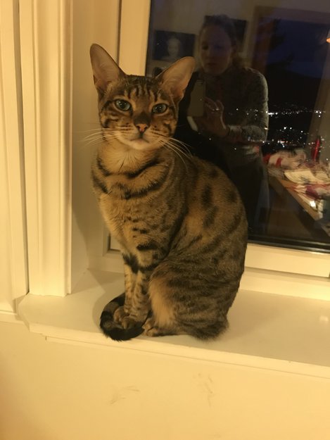 Hun er slank og langbeint, med lange spisse ører. Grå med svarte striper og spotter. Ser litt villere ut enn en vanlig huskatt.