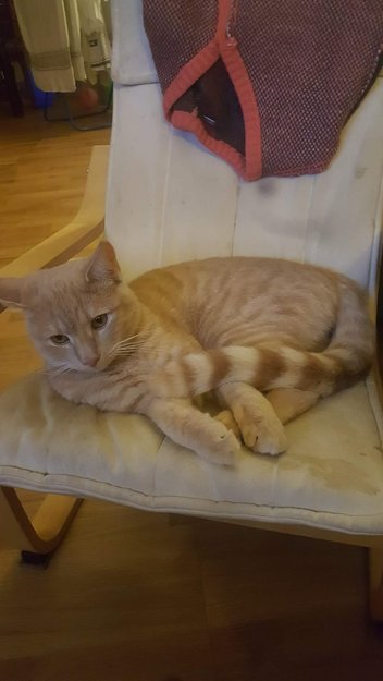 Ganske lang hale med orande/latte og hvite striper. Har et grønn id-merke på venstre øret.