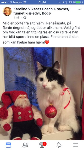 Milo pleier å komme hjem hver dag, men etter å ha gått ut torsdag 21 desember kom han ikke tilbake. Etter å ha snakka med mange naboer, viste det seg forresten at også en annen nabokatt forsvant. De sa deres katt (stor og svart pels) forsvant dagen etterpå.