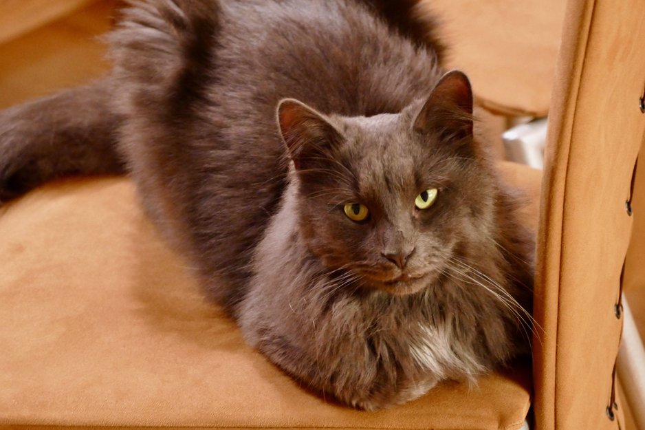 Grey, long hair, small white spot at the chest.