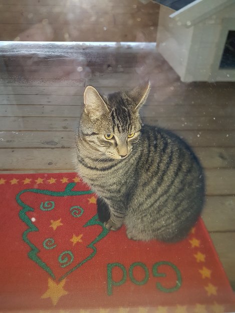 Er svart og gråstripet og ca 1 år gammel og ikke redd for mennesker