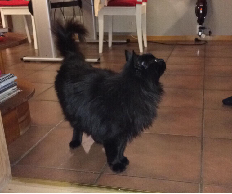 Sort langhåret katt funnet på Melhus (Strandveien). Kom til oss på julaften. Kjærlig, kontaktsøkende og tillitsfull. Har en knekk ytterst på halen og orange øyer. DEL GJERNE slik at katten kommer tilbake til riktig eier!