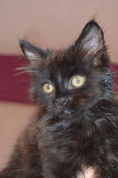Kattungen er seks, syv uker gammel. Har en tynn og spe stemme. Lang bustete hale. Dusker i ørene og mellom tærne. Den har et par bare flekker nederst på ryggen