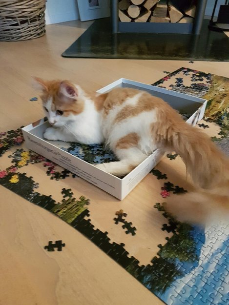 En liten katt kom seg bort fra familien sin og var ute i kulda i flere dager. Etter noen dager ga han nesten opp håpet. Sliten og kald møtte han en alfahann, den tøffeste katten i gata! Han forbarmet seg over ham og tok ham med inn katteluka til eieren sin. Eieren var en koselig gammel dame som elsket dyr og ga ham mat, varme og husly. Det høres ut som et Disneyeventyr, men det er virkeligheten! Nå er Shire hjemme igjen og jeg vil takke alle som delte bilder av ham!