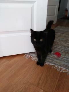 Liten svart frøken med litt lang pels, pleier å ha halen rett opp til værs. Hun har nå løpetid og er da "rømt" hjemmefra og lager lokkelyder. Lystrer til navnet Paper og er sosial.