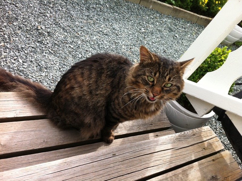 Møtte på ham første gang ca 3. august, han gikk rundt og skreik i nabolaget. Gjemte seg litt unna, men kom raskt fram for å få kos, han virker tillitsfull og vant til mennesker. Har spurt ham om han har rota seg bort, men han svarer liksom ikke ordentlig.