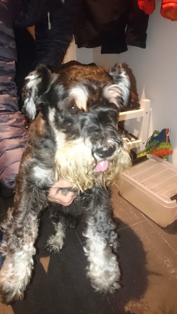 Liten schnauzer funnet ved Skranevannet, stien ved vannet, lørdag kveld, ca 21:00. Hunden er litt "rund i kantene" men et tynt rødt/rosa Hunter halsbånd.