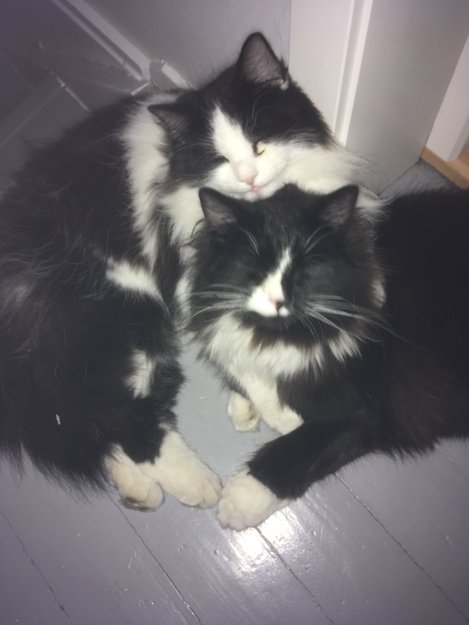 Ganske stor katt, lang pels.bakerste katten på bildet som er borte
