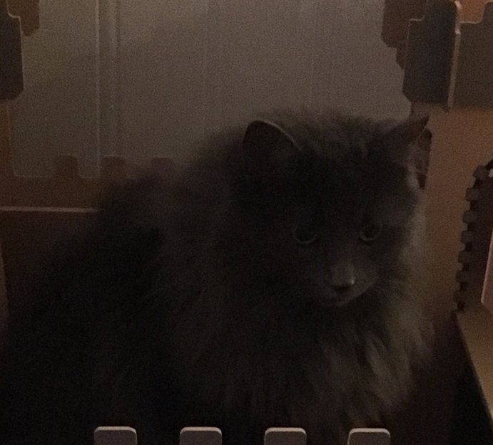 Pus er 1.år gammel, mørk grå og den har delvis barbert hale.
