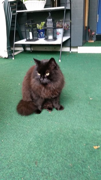 4 kg. Ca 12-13 år. Veldig sky og redd. Brunskjær i den sorte pelsen. Barbert på ene forlabben. Mangler en hjørnetann. Har epilepsi