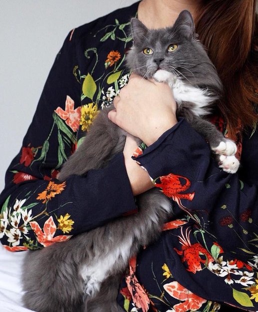 Katten er grå, med hvit underside. Gule øyne, og veldig liten av vekst. Kan minne litt om en kattunge selv om den er et par år.
