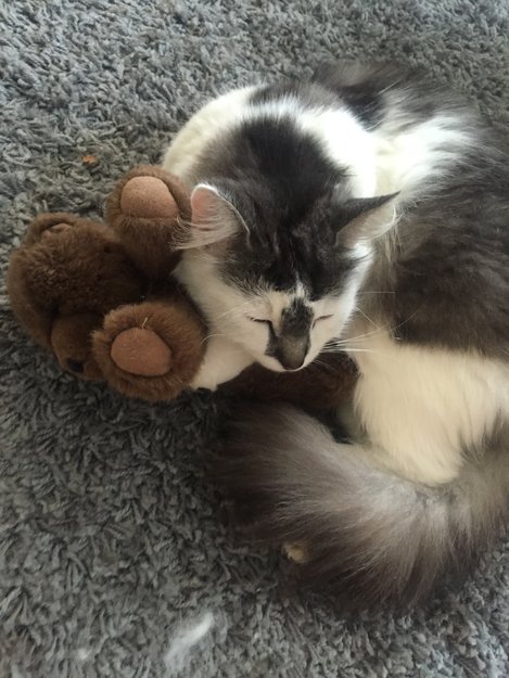 Ganske liten og langhåret katt, med hvit som grunnfarge og flere grå partier, deriblant et grått parti på nesa.