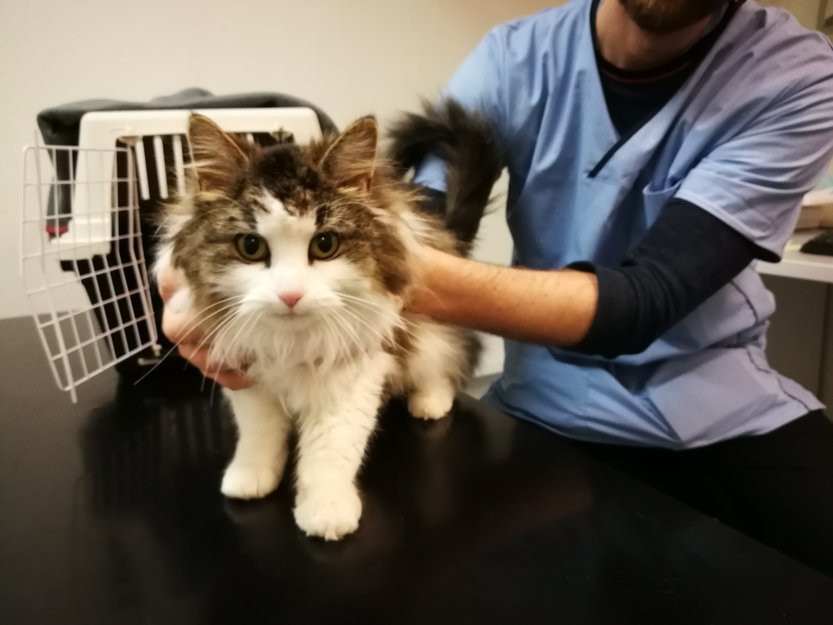 Katten gikk etter veien, finner tok på katten og kjente hun var tynn og mange floker så tok med seg katten og ringte oss.