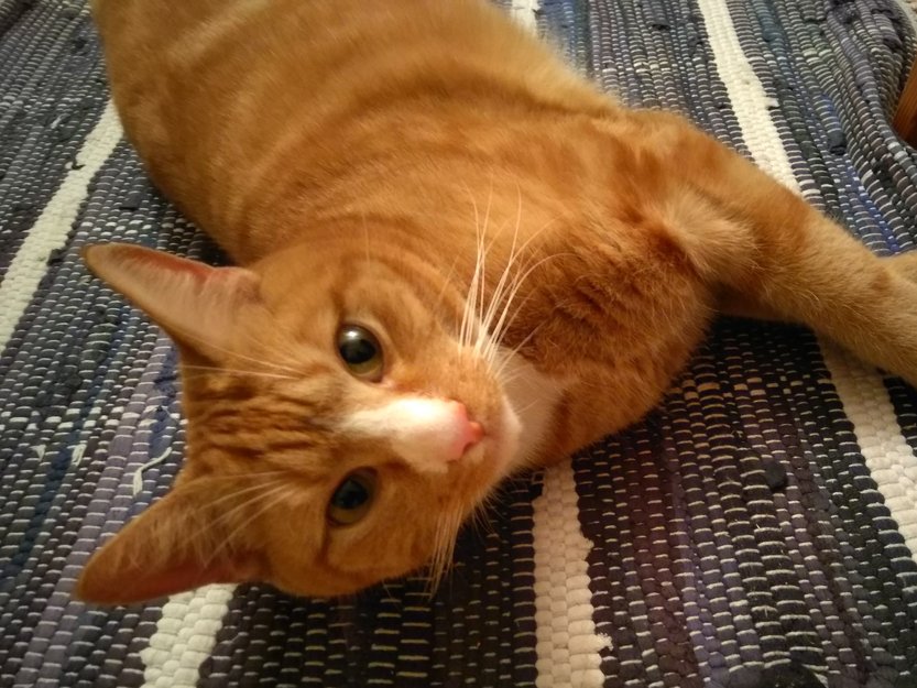 Oransje makrellstriper og hvite sokker/snute. Veldig kjælen og kontaktsøkende.