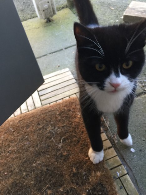 Ser frisk og sunn ut. Veldig kalt ute og den vil inn. Dette skjer dagen etter også. Jeg tar den opp å inn i gangen lørdagskveld for den er kald. Slipper den ut og den står utenfor i dag igjen. Lagt ut bilde på Torvmoen FB uten å få kontakt med eier.