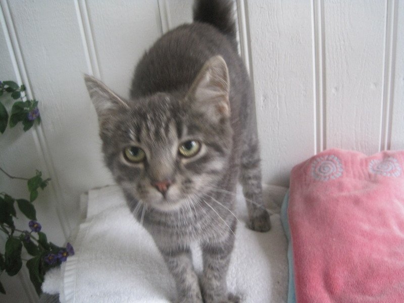 Veldig kosete, gråstripete, ung hunnkatt/kattunge.