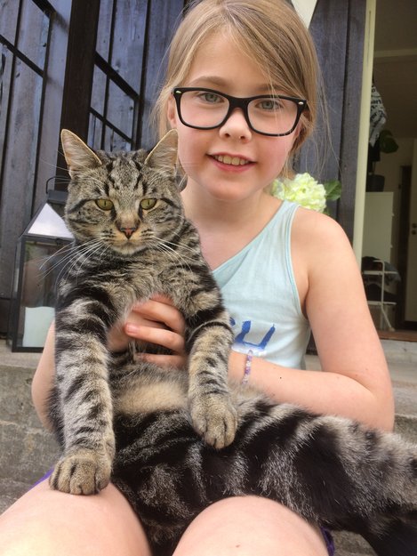 Stor tigerfarget kastrert hannkatt som er chippet (M i øret). Han er helt symmetrisk i mønster, lysere på magen. Liker å bli klødd og kost med. Han har katteluke og går inn og ut som han selv vil. På vinteren er han ikke lenge ute av gangen. Liker å være inne nå når det er kaldt. Han er vanligvis inne hele dagen og sover. Nå har vi ikke sett han på over ett døgn. Det er iskaldt ute, så vi er veldig lei oss både store og små og savner han veldig.