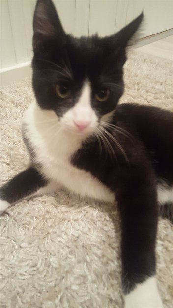 Svart med hvite soner i ansikt og på poter. Har en hvit sone Ytters på halen.