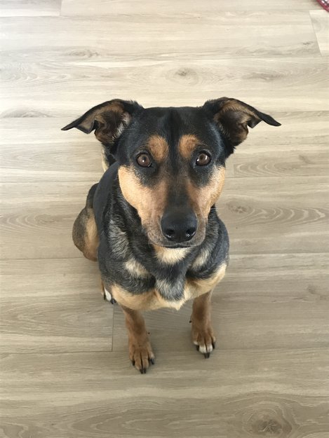 Tynn mellomstor rottweilerblanding. Svart og brun med litt hvitt. Tre hvite poter og en brun. Skadet fra en ulykke en måned tilbake i tid, en vond hofte og et arr på låret..