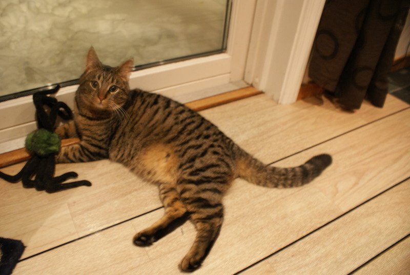 Middels stor hannkatt. Hvit under haka. Ikke tatovert i øret, men brikke i nakken.