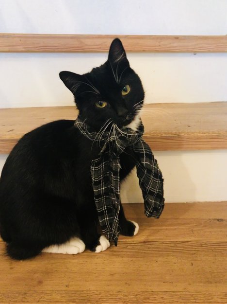 9 måneder gammel han katt, svart med hvite poter og hvit diamant i halsregionen. Kan være kontaktsøkende da han er en uerfaren utekatt.