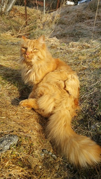 Det går en stor oransje katt i området, ca 6 kg. En skikkelig slosskjempe av en katt men vennlig når du prater til ham. Han ser ustelt og syk ut, han har store pels klumper på ryggen. Jeg er bekymret for at pus ikke har et hjem ettersom pelsen er så ustelt.