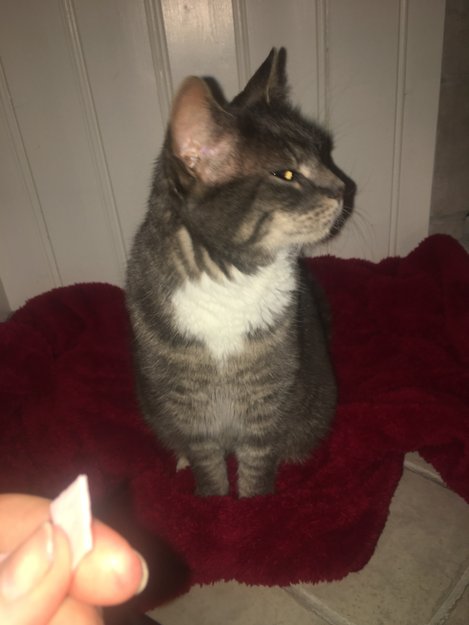 Alder er uvisst men han er utrolig kosete, har en spesiel knekk på halen om gjør at den snurrer rundt på en måte å han e ikkje menneskesky