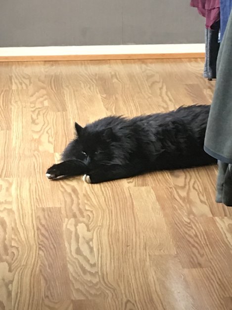 Han koser ved å hoppe opp på to ben å stryke hode mot benet mitt eller hånden min når jeg skal smeike han. Svart med hvite poter.