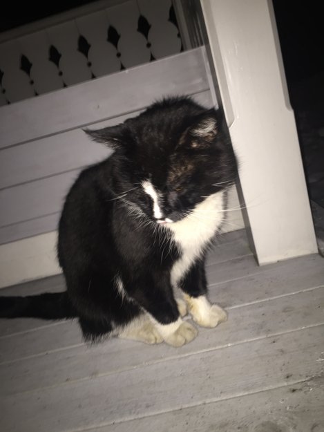Denne katten har mjauet rundt huset i noen dager. Den er svart med hvite detaljer, er det noen som savner den?