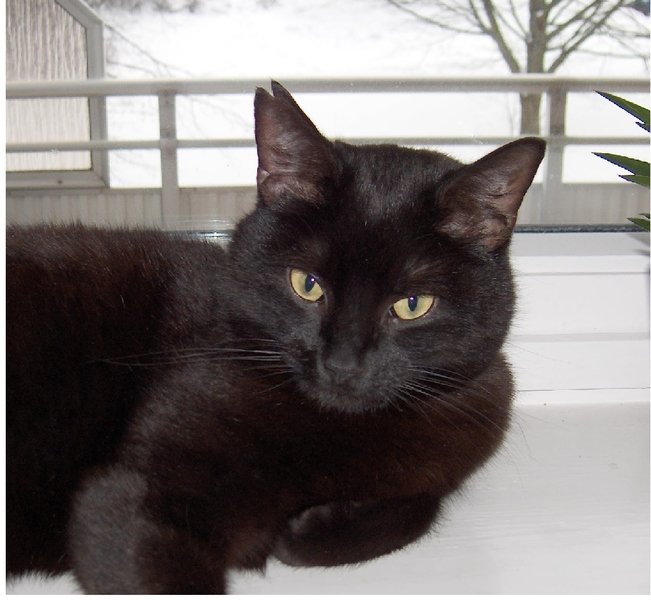 Sort vakker katt med ett hakk i sitt høyre øre. Øremerket men det er nesten uleselig pga. hans mørke farve.