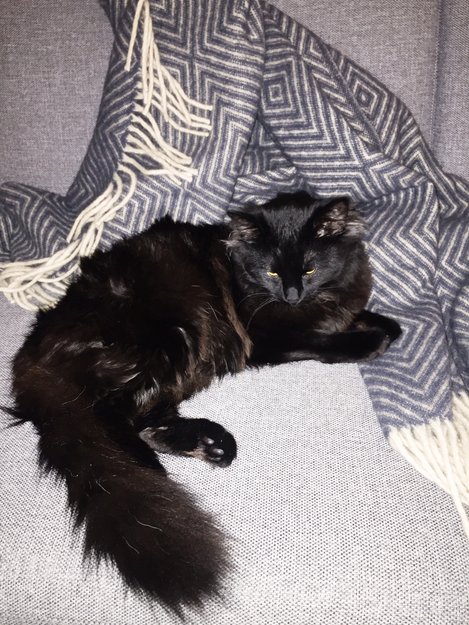 Han har "pels" som stikker ut av ørene, helt svart. Bittelitt grått i halen og i pelsen som stikker ut bak ørene. Han er kastrert og veldig redd og usikker på mennesker han ikke kjenner til.