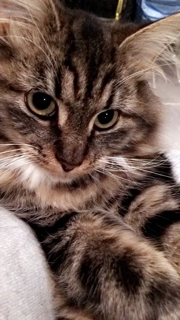 Brun/svart skimret pels. Hvit på brystet og spesielt på den ene poten.