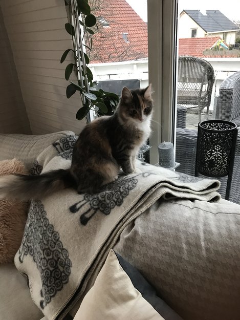 Hun er en liten hunkatt på nesten 11 måneder. Hun er ikke lett å få fatt i ute; spesielt av andre enn familien. Hun er Blåcremspottet med hvit, som ser ut som lyegrå med lyserøde flekker og hvitt bryst. Hun er også skipskatt som betyr at hun har en ekstra tå på alle labbene, altså 6 tær.