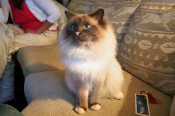 Bobby er en blåmasket birma, har akkurat operert så han er barbert på magen.
