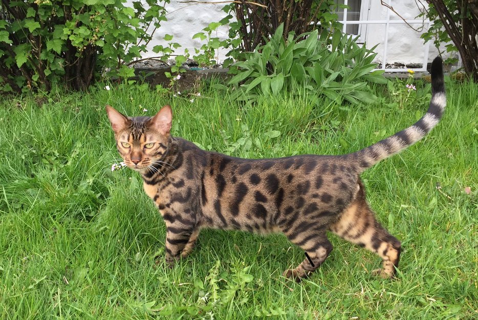Svartspottet med varm brun undertone. Slank middels stor katt.