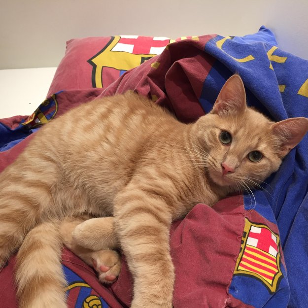 Tigerstripet, lyse beige, gult halsbånd med refleks, id merke i venstre øre, blå grønne øyne.