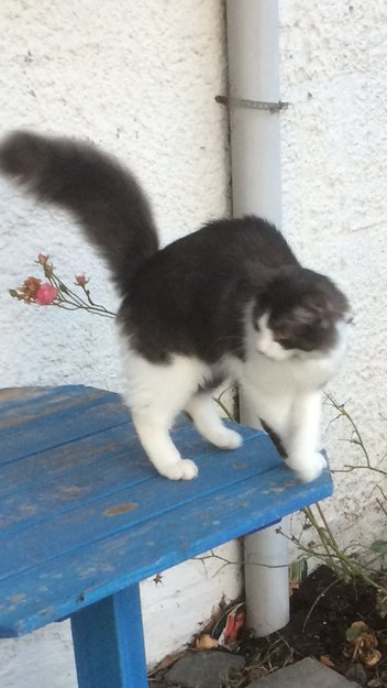 Fire hvite bein, noen få svartgrå felt på bakbeina, hvit fra nesen og i en spiss opp pannen. Gråsvart resten. 90 graders knekk helt ytterst på halen som ikke sees men kjennes. Hadde halsbånd med magnet til katteluke og telefonnummer da han forsvant.