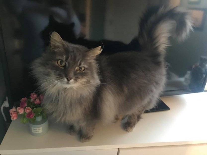 Oskatten fikk flere tips om at denne katten gikk ute i kulden. Oskatten tok den inn slik at den skulle slippe å fryse i kulden mens vi søkte etter eier. Denne katten har helt klart en eier.