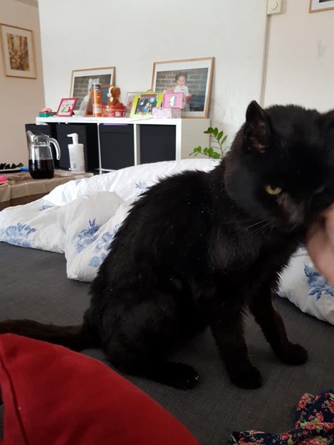 Godt voksen hunnkatt, estimert av veterinær til å være over ti år gammel. Ikke idmerket, kastreringsstatus ukjent. Ifølge folk ved hytteparken har hun gått der i flere år. Frostskade på halen, tynn og underernært, men snill og kosete pus son tydelig har hatt et hjem.