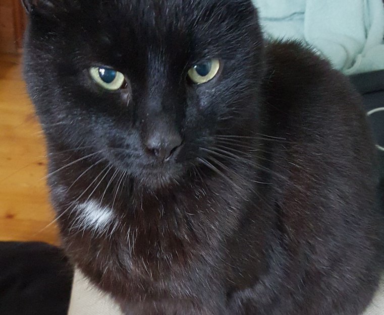 Hannkatt kastrert. Svart med hvitt på brystet. Mangler en hjørnetann. Er chippet. Født i 2004.