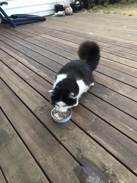 Virker snill og kontaktsøkende, veldig sulten, ser forvirret ut og ser ut som om den ikke finner veien hjem. Hvit i ansiktet men svarte ører, hvit på frambringe, svart bakpart og hale.