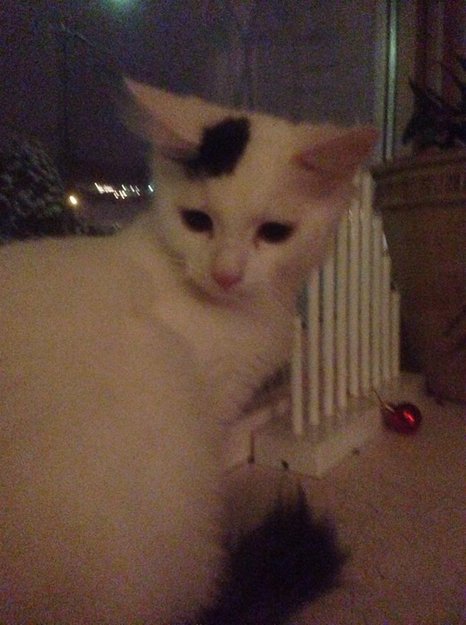 Mørk flekk på hodet. Mørke ringer nedover halen. Mørk flekk på ryggen. Har aldri vært ute og er ikke glad i lyder, sannsynligvis redd de han møter. Han er mellom 7 og 8 mnd gammel, men liten av vekst.