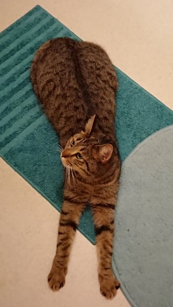 Hun har en tabby pels, grønne øyne, hvit haletipp, sorte poter og hun er nysgjerrig