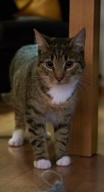 Hun er bruntigret med litt hvitt på potene, brystet og ytterst på halen. Kosete og tillitsfull katt. Knapt 2 år. På bildet er hun ca et år
