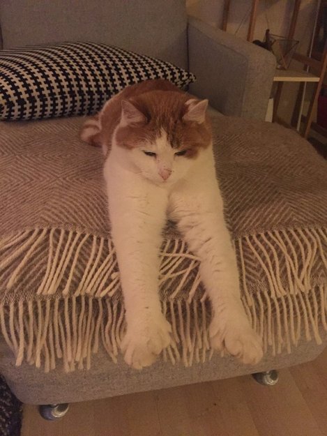 Orange og hvit. "Skipskatt" - ekstra klo/tå på hver fot (digre poter!). Lubben, veldig myk pels, ikke veldig langhåret men lengre enn korthårskatter. Tatovering i øret, men identiteten ikke overført til meg ennå, og forrige eier er ikke tilgjengelig. Jeg har ikke ID-nummeret. Tillitsfull.