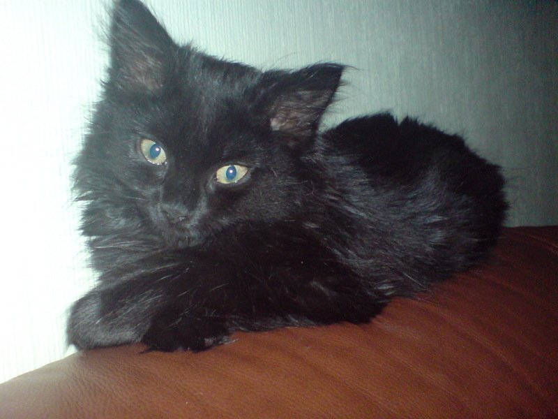 Lodden sort katt, gul/grønne øyne. Hårdusker stikker ut av ørene. Leken og oppmerksom katt. Liten jeger.