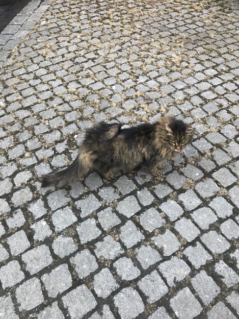 Langhåret katt gikk rundt på Nedre Bakklandet søndag. Dyrebeskyttelsen var ikke åpen så lot den være der. Ikke bånd rundt halsen.