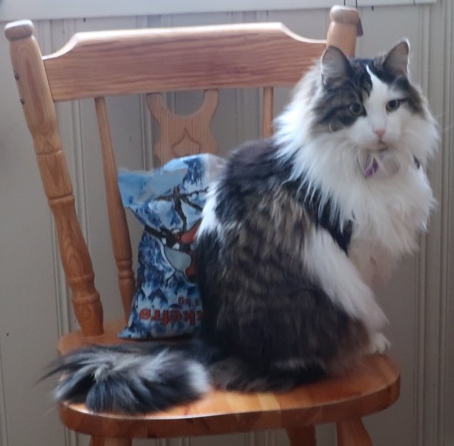Som sagt er han redd fremmede, så det er ikke lett å komme i kontakt med han, vi vil gjerne bare høre om noen har sett han, og hvor han ble sett. Han er svakt tigerstripete på det mørke på pelsen. ryggen er helt mørk utenom den hvite flekken midt på, og 2 mørke ører. Baklabbene er mørke på baksiden, ellers er labbene stort sett hvite med litt mørkt på. Hansbåndet er av no svart mykt materiale, og det henger ett lilla hjerte på det med telefon nummer på. Han liker å gjemme seg under terasser, og er en veldig stille katt.